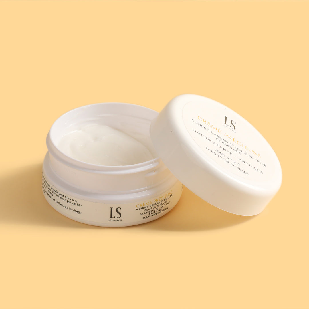 Aqua (eau), Caprylic/capric triglyceride(triglycéride caprylique/caprique), Simmondsia Chinensis seed oil (Jojoba), Glyceryl Stearate SE, Cetearyl alcohol (alcool cétéarylique), Butyrospermum Parkii (Shea) Butter (beurre de karité), Argania spinosa (huile d’argan), oil (huile), Opuntia Ficus-Indica (Prickly pear) Seed Oil (huile de figue de Barbarie), Tocopherol (Vitamine E), Xhantan Gum (gomme xhantane), Benzyl alcohol (conservateur), Dehydroacetic Acid (Acide déhydroacétique), Fragrance (parfum).